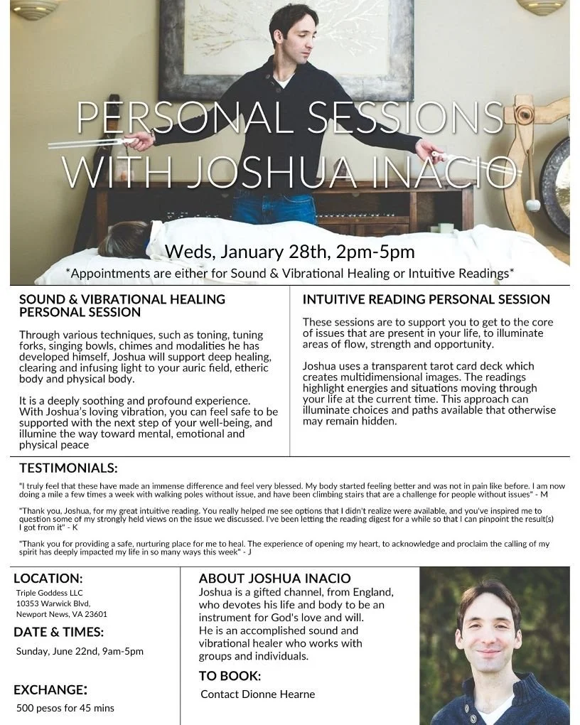 Personal Sessions With Joshua Inacio Wednesday, January 28, 2026 2:00 PM 5:00 PM Triple Goddess Wellness & Education 10353 Warwick Boulevard Newport News, VA, 23601 United States (map) Google Calendar ICS Contact Joshua by email at joshuaisaacinacio@gmail.com for Reservations